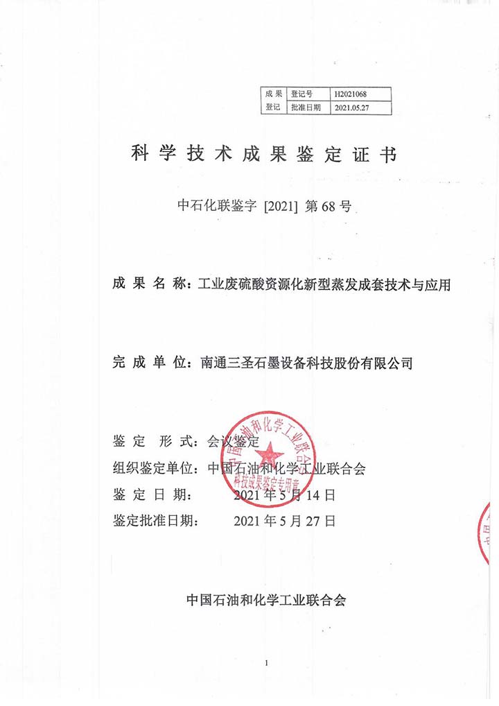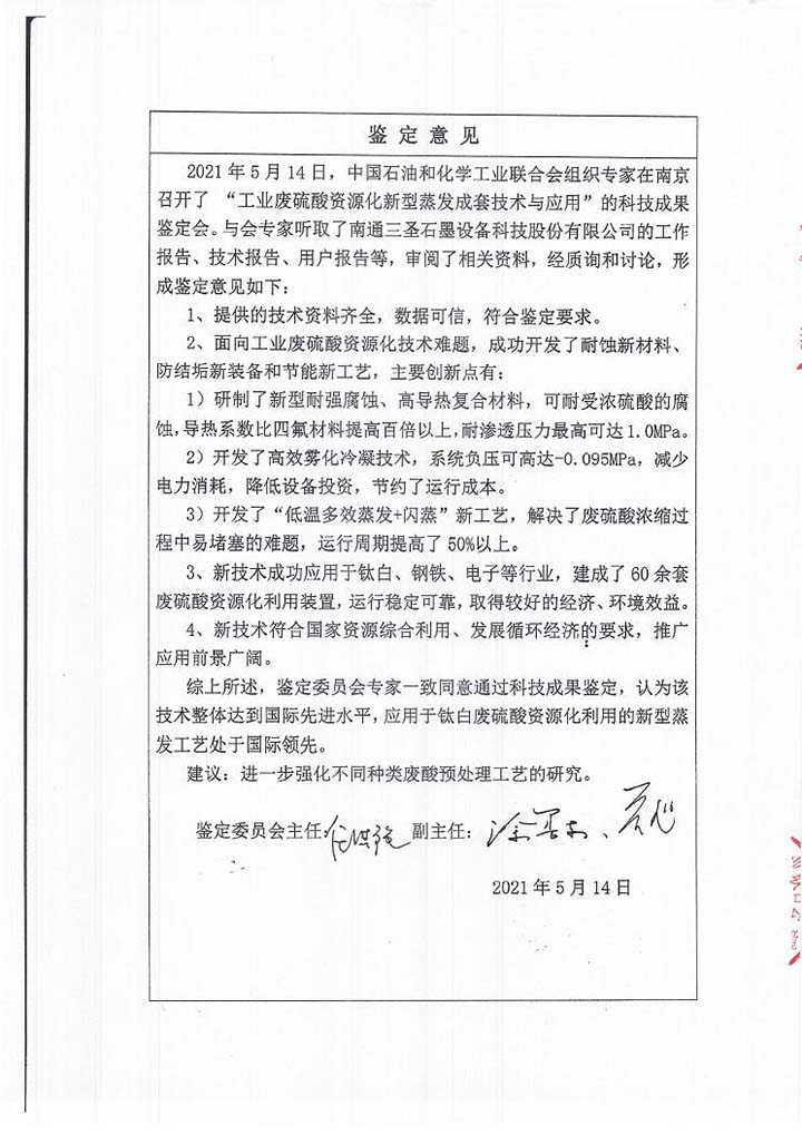 2021年5月27日,中國石油和化學(xué)工業(yè)聯(lián)合會(huì)批準(zhǔn)了南通三圣石墨設(shè)備科技股份有限公司“工業(yè)廢硫酸資源化新型蒸發(fā)成套技術(shù)與應(yīng)用”的科技成果鑒定,由南京大學(xué)任洪強(qiáng)院士擔(dān)任主任,華東理工大學(xué)涂善東院士、南京工業(yè)大學(xué)喬旭校長擔(dān)任副主任的鑒定委員會(huì)專家一致認(rèn)為,該技術(shù)整體達(dá)到國際先進(jìn)水平,應(yīng)用于鈦白廢硫酸資源化利用的新型蒸發(fā)工藝處于國際領(lǐng)先。