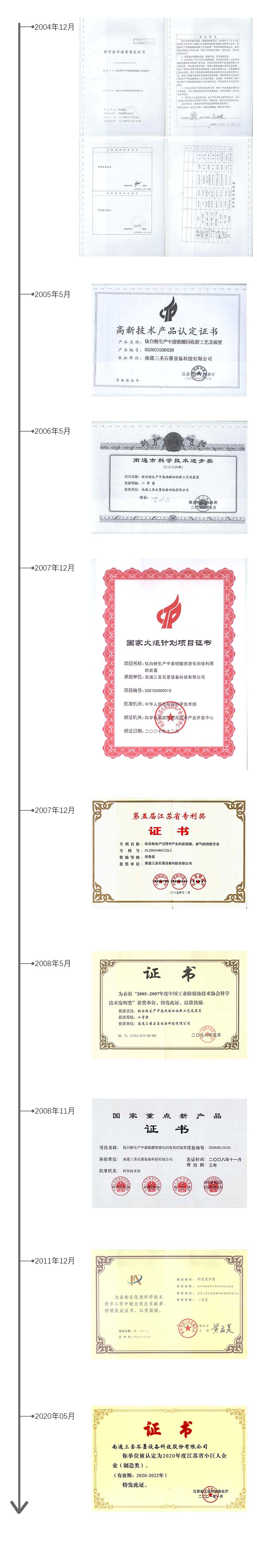 南通三圣該項(xiàng)技術(shù)先后得到了政府諸多部門的高度評(píng)價(jià)。2004年12月,“鈦白粉生產(chǎn)中廢硫酸回收新工藝及裝置”通過江蘇省科技廳組織的科技成果鑒定,鑒定意見指出,該項(xiàng)成果填補(bǔ)了國內(nèi)鈦白粉產(chǎn)業(yè)廢硫酸回收技術(shù)及裝備的空白,總體水平達(dá)到國際先進(jìn)。2005年5月,該項(xiàng)成果被認(rèn)定為江蘇省高新技術(shù)產(chǎn)品。2006年5月,該項(xiàng)成果榮獲南通市科技進(jìn)步二等獎(jiǎng)。2007年12月,“鈦白粉生產(chǎn)中廢硫酸資源化回收利用的裝置”被科技部列為國家火炬計(jì)劃項(xiàng)目。2007年12月,“鈦白粉生產(chǎn)過程中產(chǎn)生的廢硫酸、廢氣的回收方法”榮獲江蘇省優(yōu)秀專利獎(jiǎng)。2008年5月,“鈦白粉生產(chǎn)中廢硫酸回收新工藝及裝置”榮獲中國工業(yè)防腐蝕技術(shù)協(xié)會(huì)技術(shù)發(fā)明二等獎(jiǎng)。2008年11月,“鈦白粉生產(chǎn)中廢硫酸資源化回收利用裝置”被科技部、環(huán)保部、商務(wù)部、國家質(zhì)檢總局認(rèn)定為國家重點(diǎn)新產(chǎn)品。2011年12月,“鈦白廢酸資源化節(jié)能回收系統(tǒng)裝置”榮獲中華全國工商業(yè)聯(lián)合會(huì)科技進(jìn)步二等獎(jiǎng)。2020年,公司以工業(yè)廢副硫酸低能耗蒸發(fā)濃縮與資源化回收成套裝備產(chǎn)品獲得江蘇省專精特新小巨人企業(yè)榮譽(yù)稱號(hào)。
