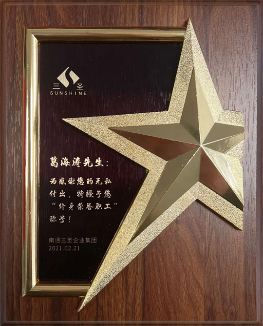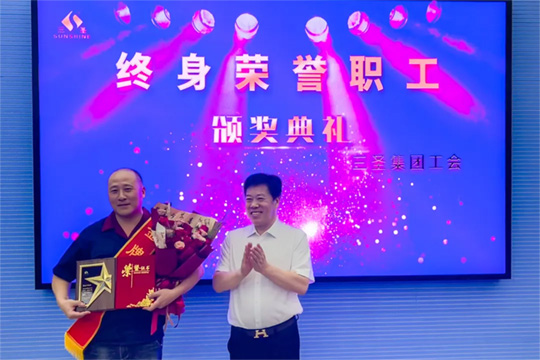 三圣奮斗史中閃耀著這樣一顆璀璨之星,他以堅定的信念和不懈的努力,登上榮譽巔峰,成為開發(fā)區(qū)當(dāng)之無愧的一名“金牌員工”,并被三圣集團董事會、三圣工會授予“終身榮譽職工”的光榮稱號。